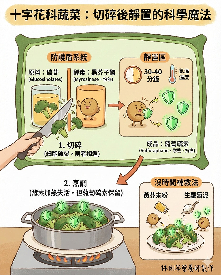 * 原理: 這些生的十字花科親戚含有活跳跳的黑芥子酶,它們進到你的胃裡後,可以幫忙把你剛才煮熟蔬菜中沒來得及轉化的原料,繼續轉化成蘿蔔硫素。總結來說,「切碎靜置」並非都市傳說,而是一個利用簡單化學原理來最大化蔬菜營養價值的聰明備餐技巧喔!大家不妨試試看喔🙌