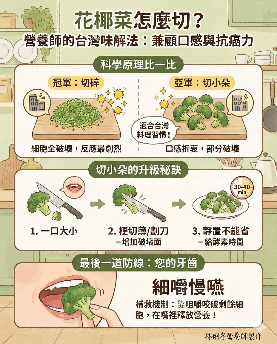 切成「小朵」絕對比整顆不切好,也能產生蘿蔔硫素。雖然效果沒有「切碎」那麼強烈,但這是一個兼顧口感、飲食習慣的「折衷方案」。