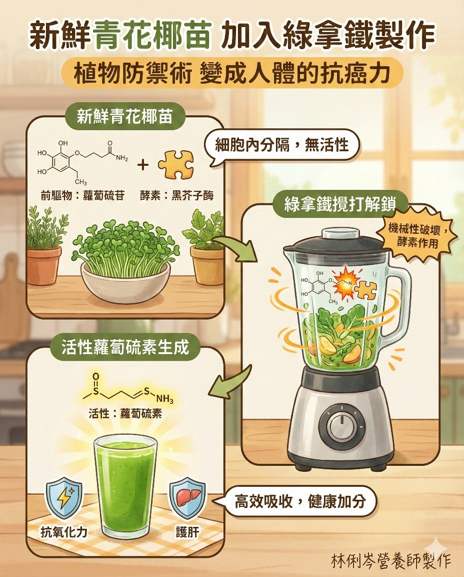 🥦「青花椰苗」青花菜苗也是十字花科蔬菜,它就是青花菜的小寶寶,它含有比青花菜更多的原料(硫苷),當然就有更多機會生成更多蘿蔔硫素,而青花椰苗洗淨可以生食,所以它很常出現在我的早餐餐盤,來不及切碎,就用牙齒細嚼慢嚥,或是我也很常把它加入綠拿鐵的製作,把蘿蔔硫素更有效率的放大