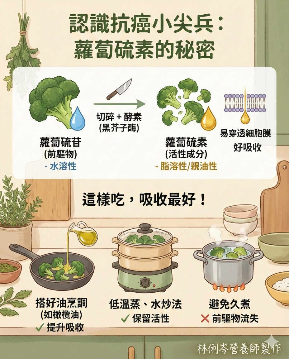 ✅搭配油脂吸收更好: 雖然蘿蔔硫素的生物利用率(Bioavailability)本身就很高(約 70% 以上),但研究發現,在烹調中加入優質油脂(如橄欖油或與酪梨同食),可以提升其穩定性並幫助腸道吸收。